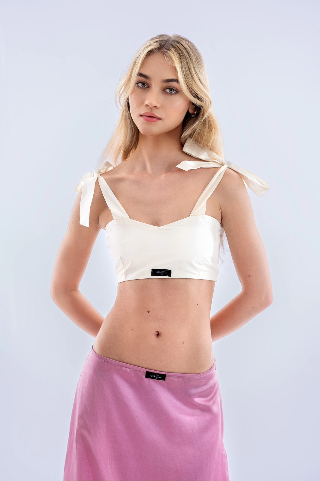 Ez a különleges fényű, hernyóselyem taftból készült crop top modern, mégis romantikus darab. A vállon masnira köthető pántok és a finoman strukturált anyag, valamint az elöl diszkréten elhelyezett fekete fehér pamut-szőtt márkajelzés különleges megjelenést kölcsönöznek. A szív alakú mellrész enyhén formázott, kiemeli a dekoltázst, míg a hátul gumírozott panel rész biztosítja a kényelmes tartást és a tökéletes illeszkedést.