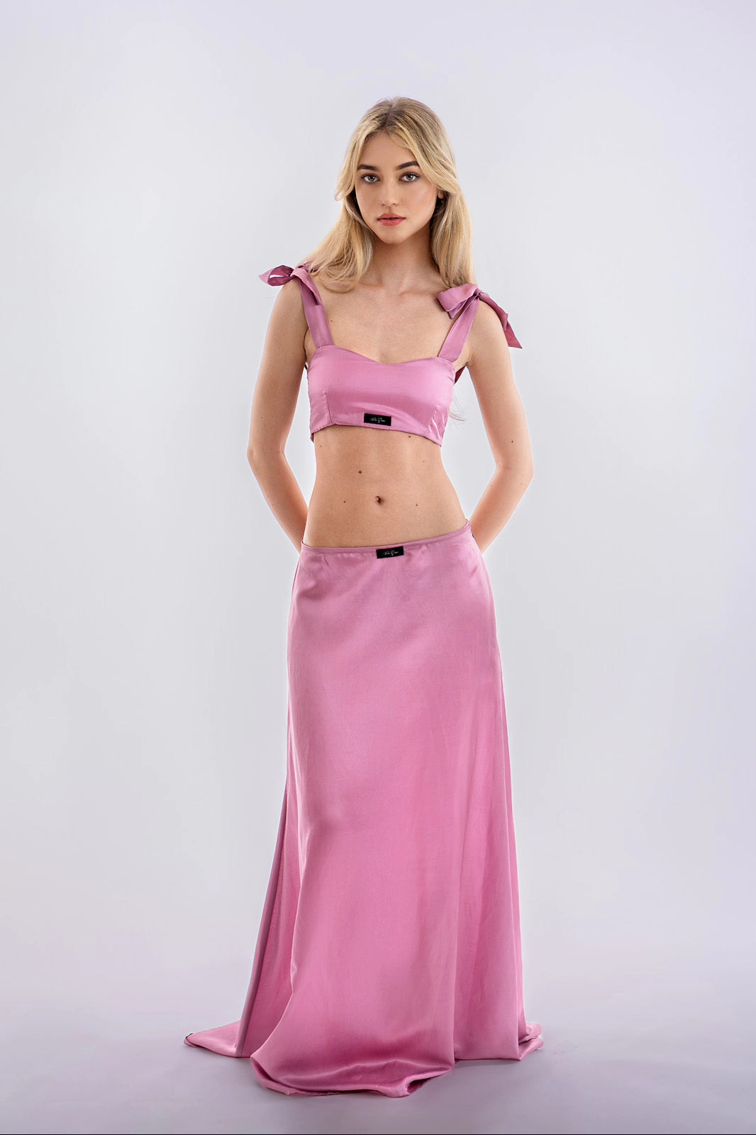 Ez a lágy fényű, orchidealila pamut-selyem crop top a romantikus részletek és a modern szabás tökéletes harmóniája. A masnira köthető vállpántok egyedivé és állíthatóvá teszik a fazont, míg a hátul gumírozott kialakítás gondoskodik a kényelmes illeszkedésről. A finoman formált szív alakú mellrész nőies sziluettet ad, miközben megőrzi a természetes könnyedséget.