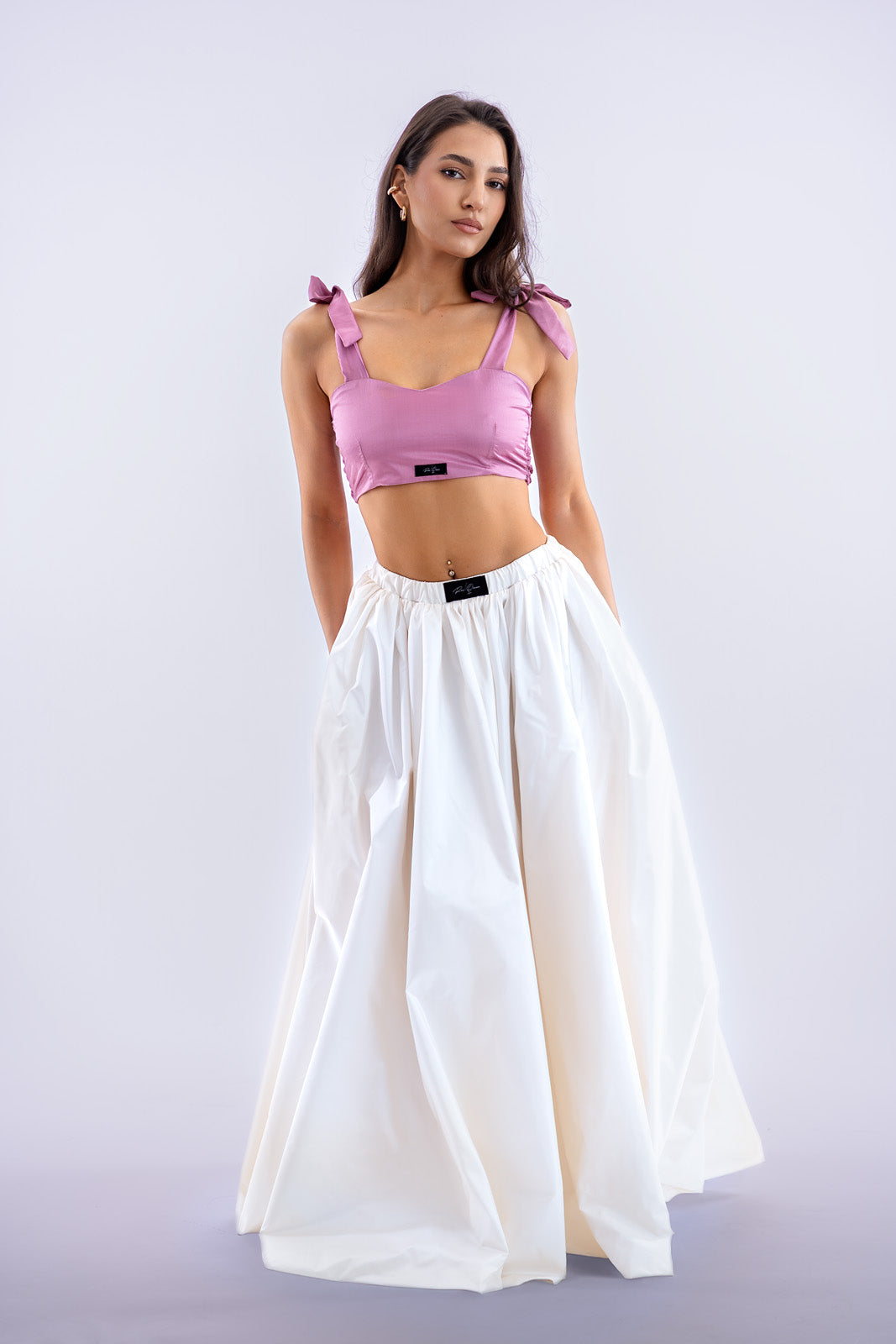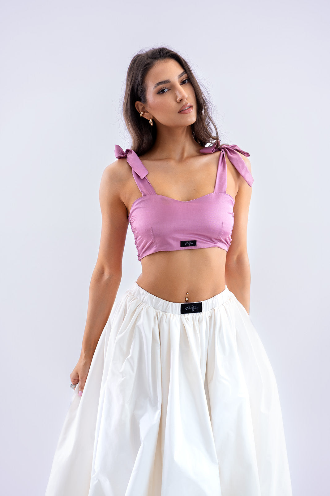 Ez a lágy fényű, orchidealila pamut-selyem crop top a romantikus részletek és a modern szabás tökéletes harmóniája. A masnira köthető vállpántok egyedivé és állíthatóvá teszik a fazont, míg a hátul gumírozott kialakítás gondoskodik a kényelmes illeszkedésről. A finoman formált szív alakú mellrész nőies sziluettet ad, miközben megőrzi a természetes könnyedséget.