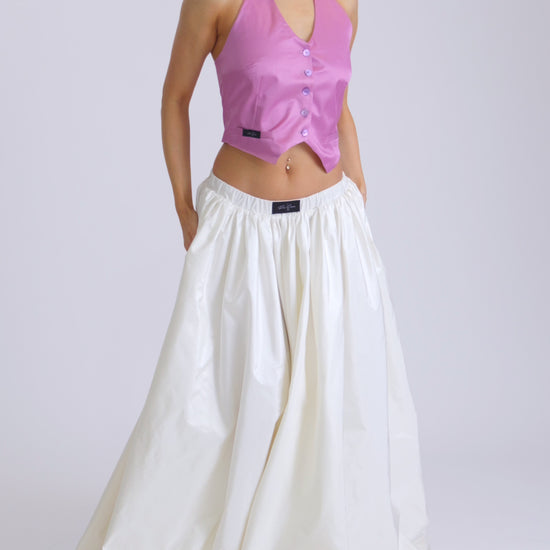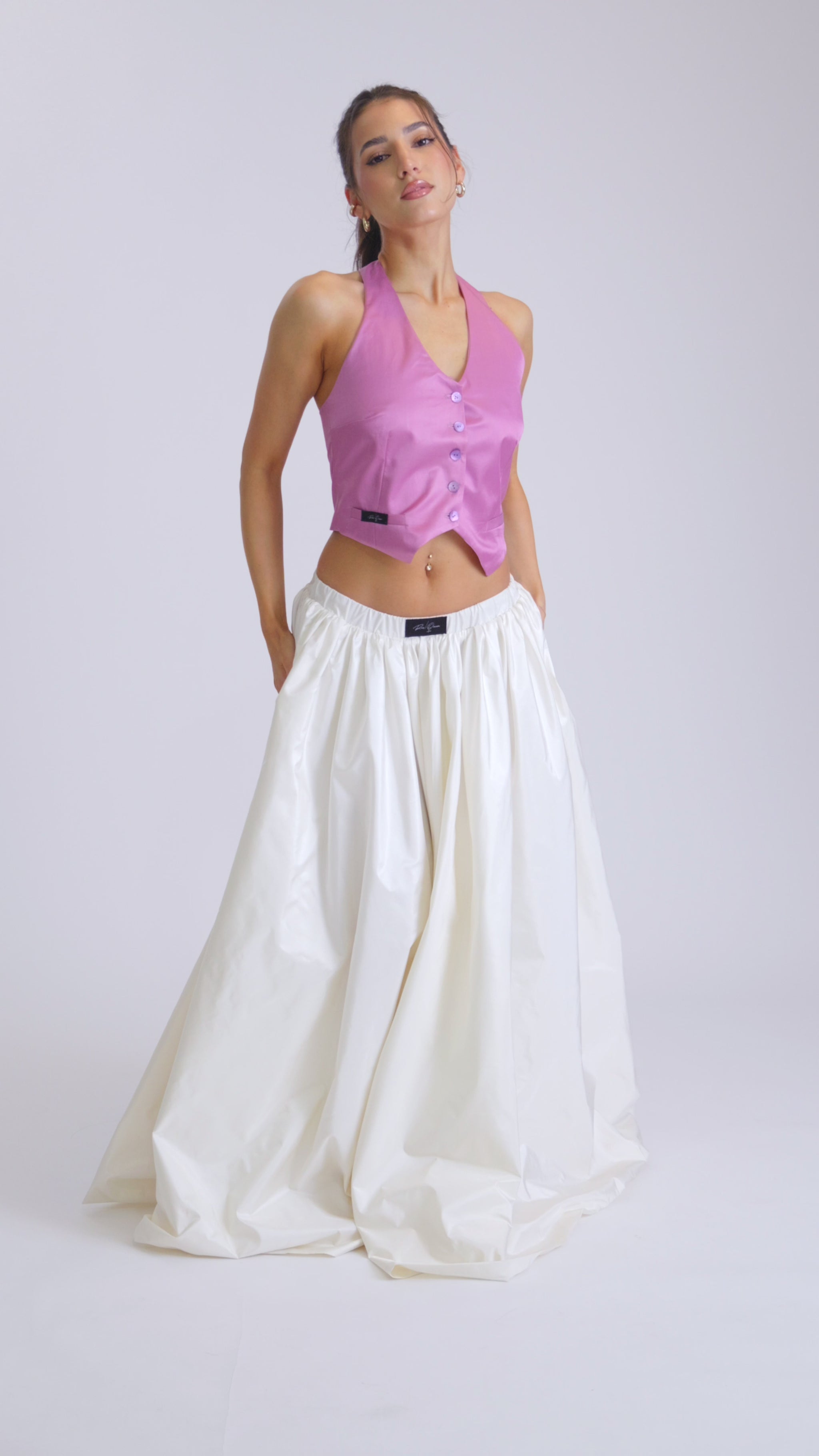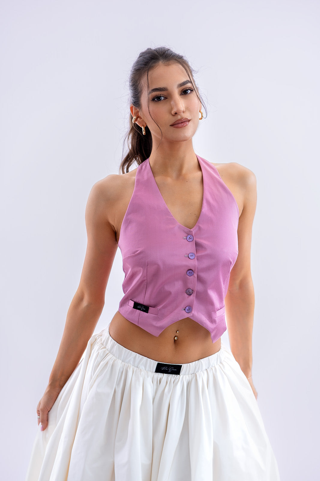 Ez az orchidealila, pamut-selyem mellény a klasszikus tailoring és a modern, nőies stílus tökéletes ötvözete.
