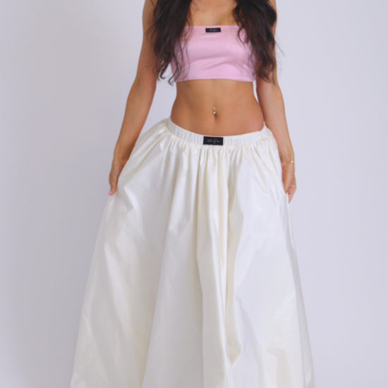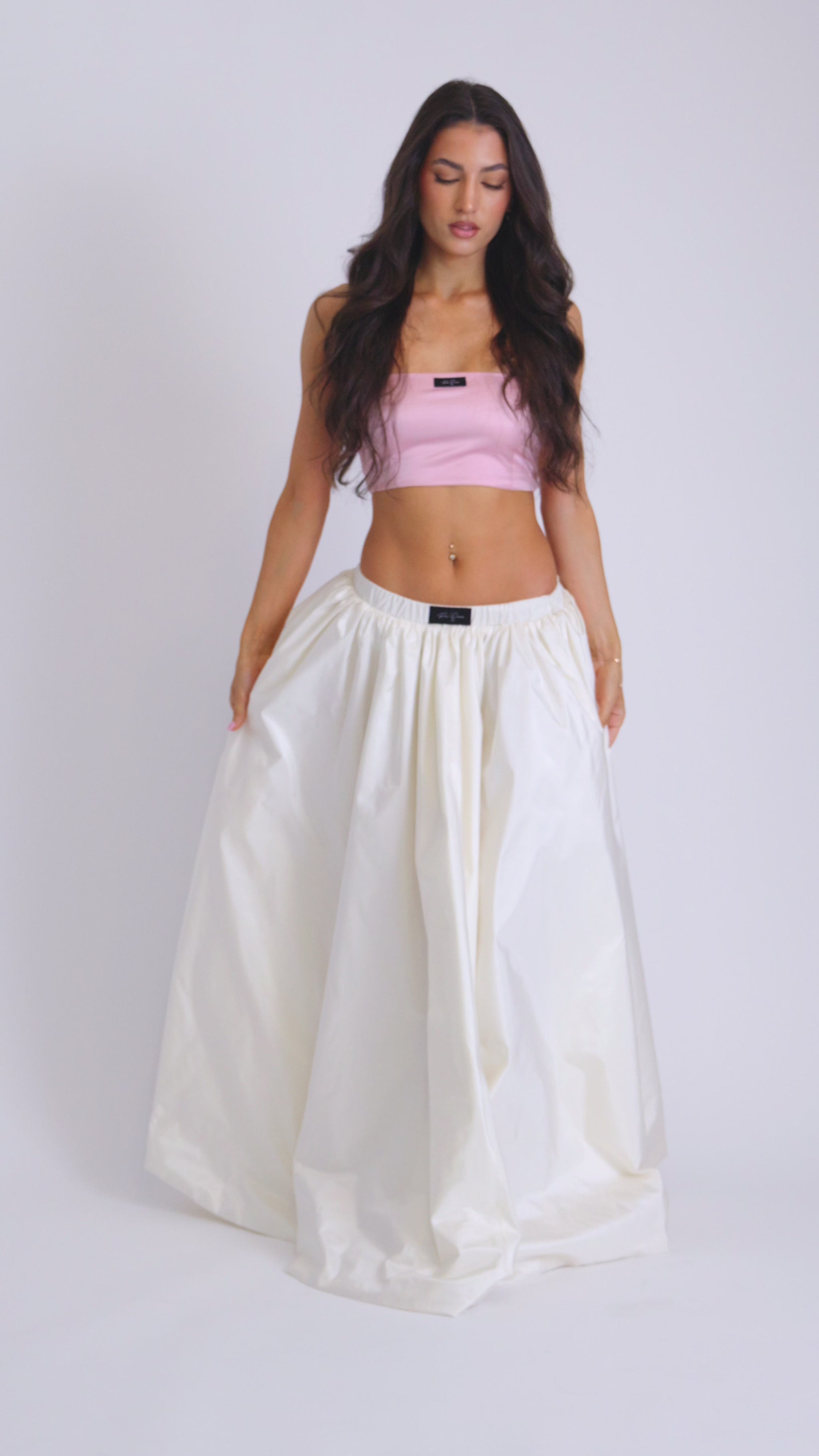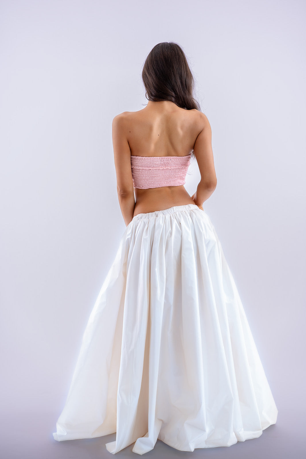 Ez a púderrózsaszín csőtop 100% hernyóselyemből készült, amely természetes fényével és selymes tapintásával azonnal luxusérzetet kelt.