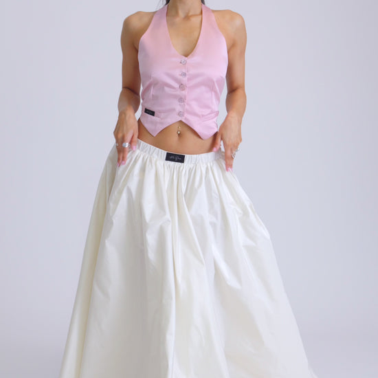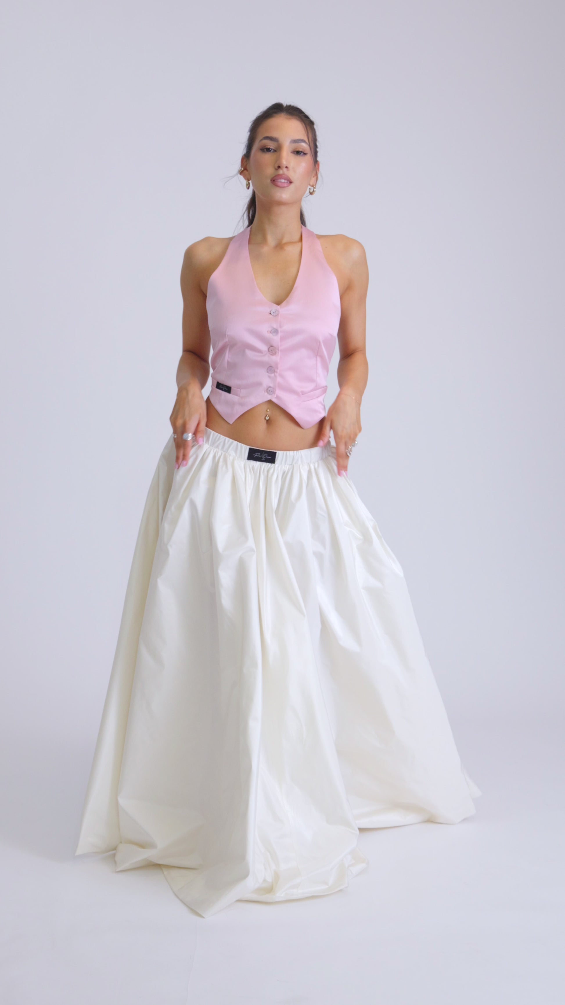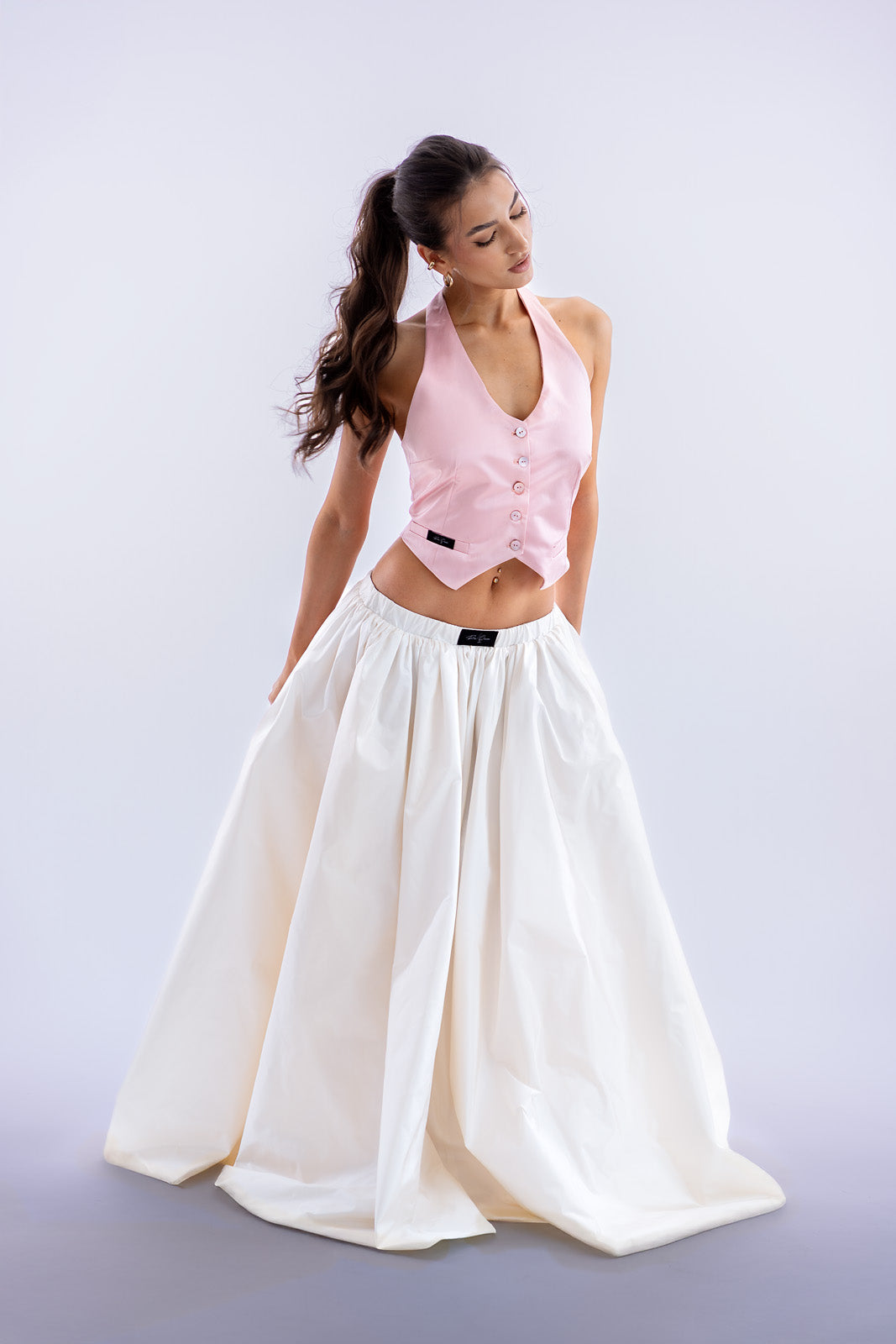 Ez a különleges szabású, rózsaszín mellény 100% hernyóselyemből készült, amely egyszerre sugároz kifinomultságot és friss, modern stílust. A mély V-kivágás, az ívelt alsó vonal, a díszzsebek és a különleges fényű anyag, valamint a kagyló gombok elegáns részletekké válnak a letisztult sziluetten.