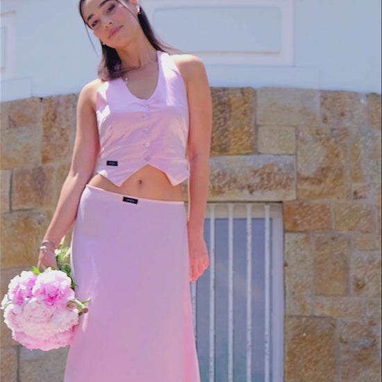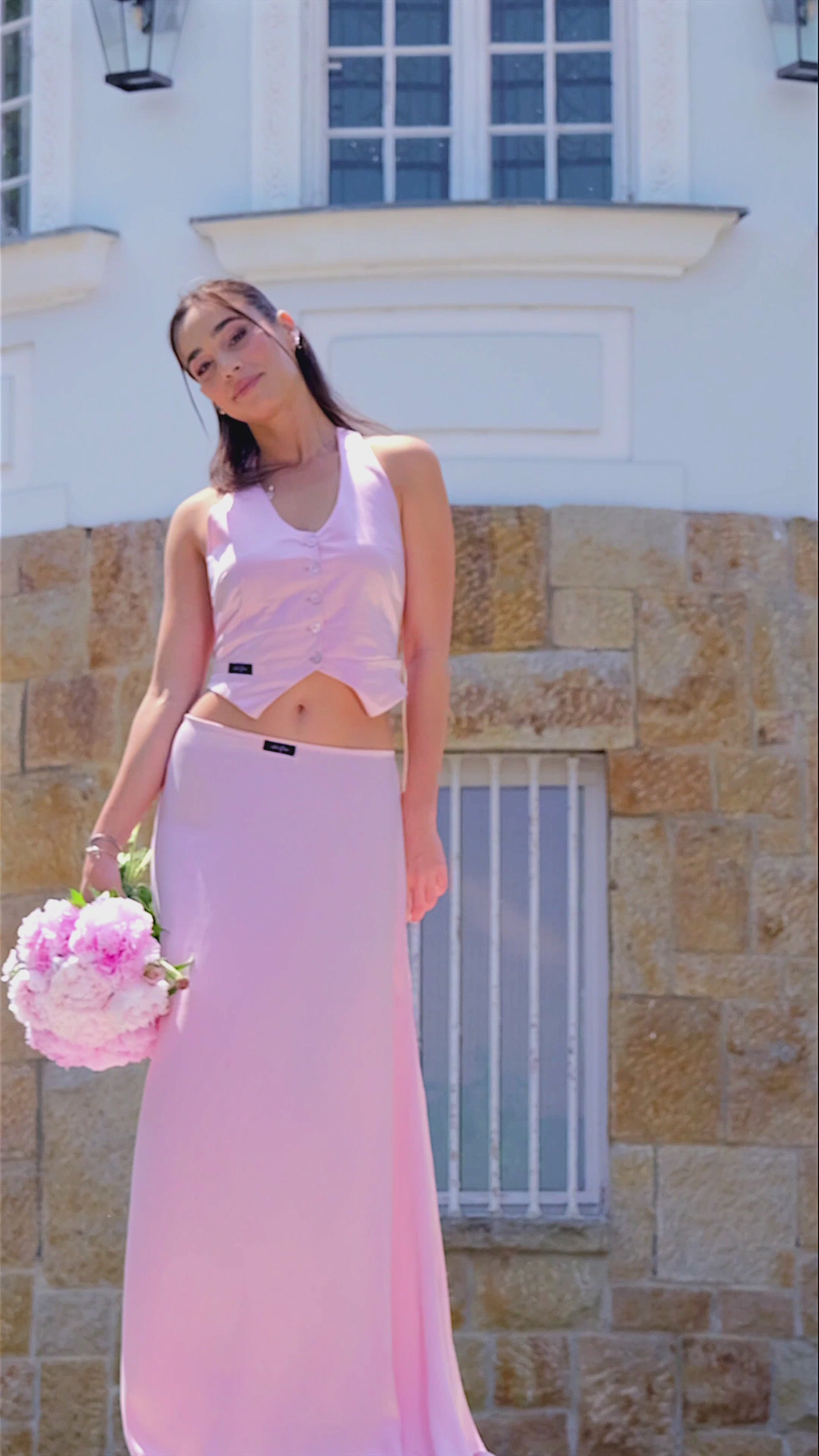Ez a légies esésű, púderrózsaszín szoknya 100% hernyóselyemből készült, egy luxusérzetet keltő alap darab, mely kifinomult és időtlen.