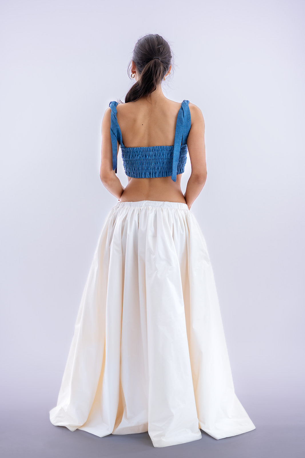 Ez a különleges, 100% hernyóselyemből készült taft szoknya a klasszikus eleganciát a modern könnyedséggel ötvözi. Légiesen könnyű, mégis határozott tartást adó anyaga, lágyan omlik körbe, miközben a látványos bőség és az anyag fénye magára vonzza a tekinteteket és exkluzív megjelenést biztosít.
