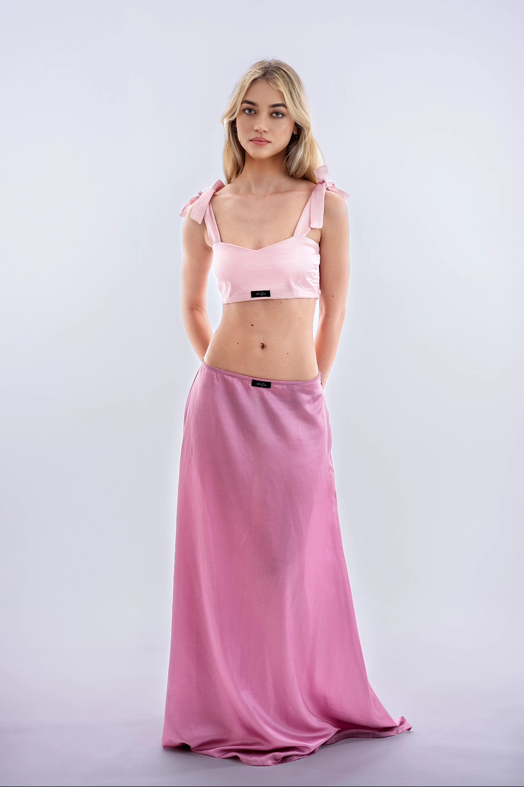 Ez a rózsaszín fényes, 100% hernyóselyemből készült crop top egyszerre elegáns és játékos. A vállon masnira köthető pántok bájt és állíthatóságot biztosítanak, míg a hátul rugalmas, gumírozott rész kényelmes illeszkedést garantál. A szív alakú dekoltázs kiemeli a nőies vonalakat, a selyem enyhe fénye pedig luxushatást kölcsönöz a megjelenésnek.