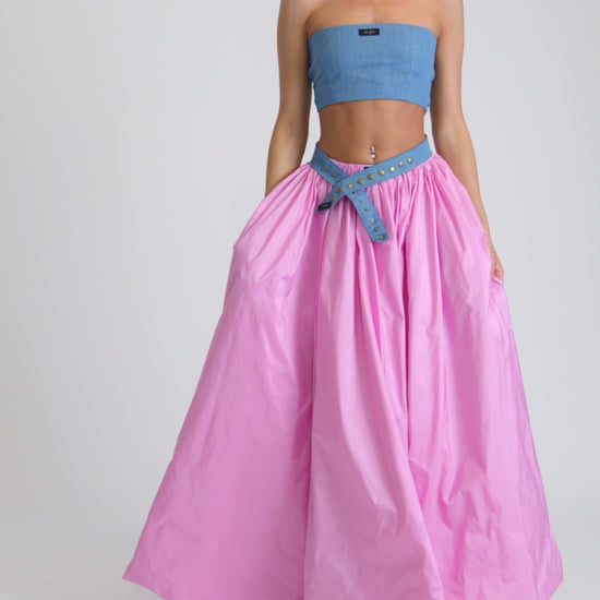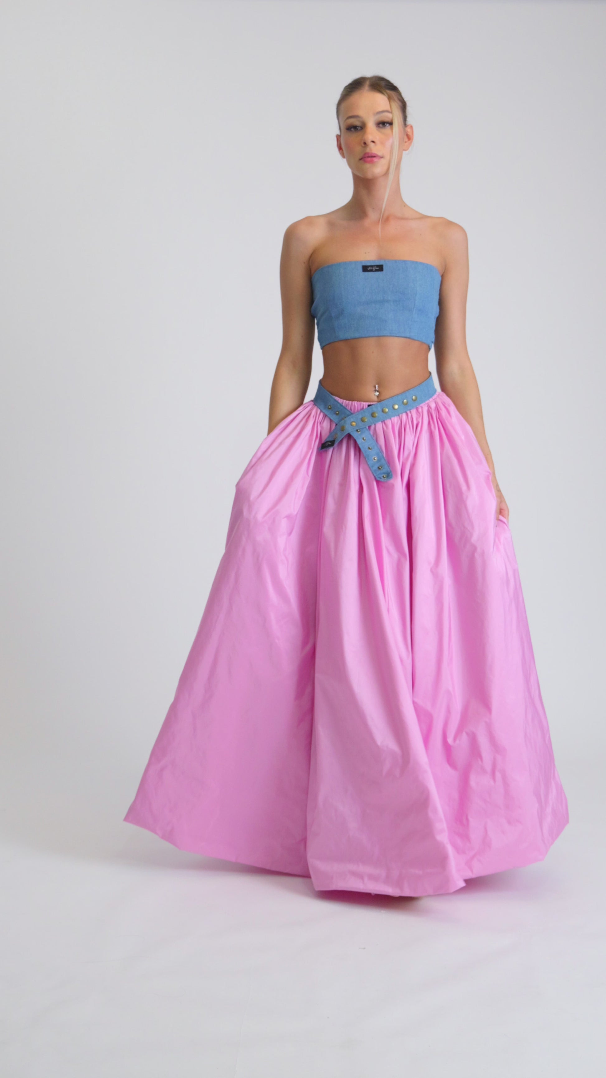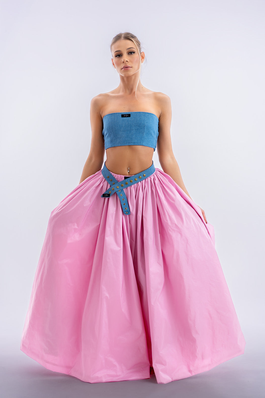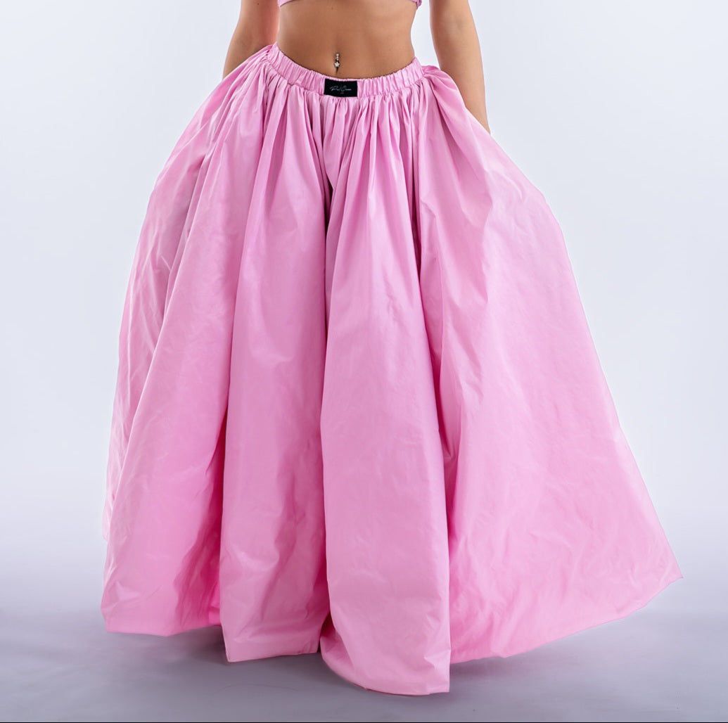 Ez a különleges, 100% hernyóselyemből készült taft szoknya a klasszikus eleganciát a modern könnyedséggel ötvözi. Légiesen könnyű, mégis határozott tartást adó anyaga, lágyan omlik körbe, miközben a látványos bőség és az anyag fénye magára vonzza a tekinteteket és exkluzív megjelenést biztosít.